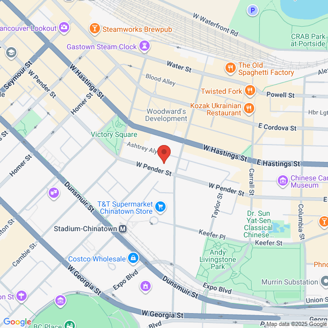 Street parking available. Parking lot 1 block away at Beaty and Pender. Free 2 hour parking available for patrons of International Village across the street.